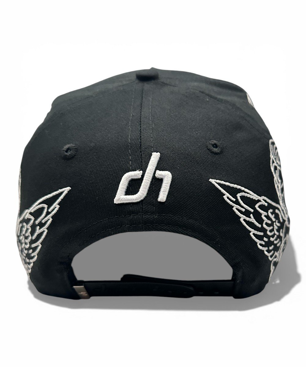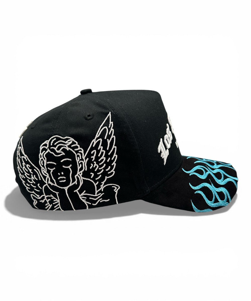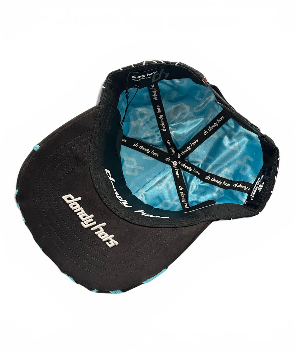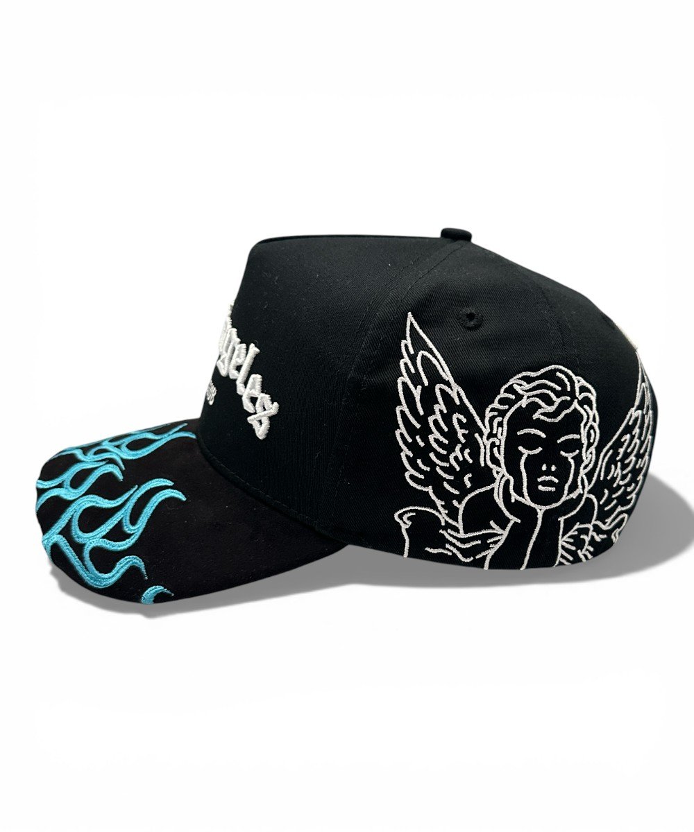 La gorra presenta un bordado frontal en 3D con el texto “Los Ángeles” en estilo chicano y “Dandy Club”. Los paneles laterales tienen bordados de ángeles tristes y la visera es de gamuza con flamas bordadas.